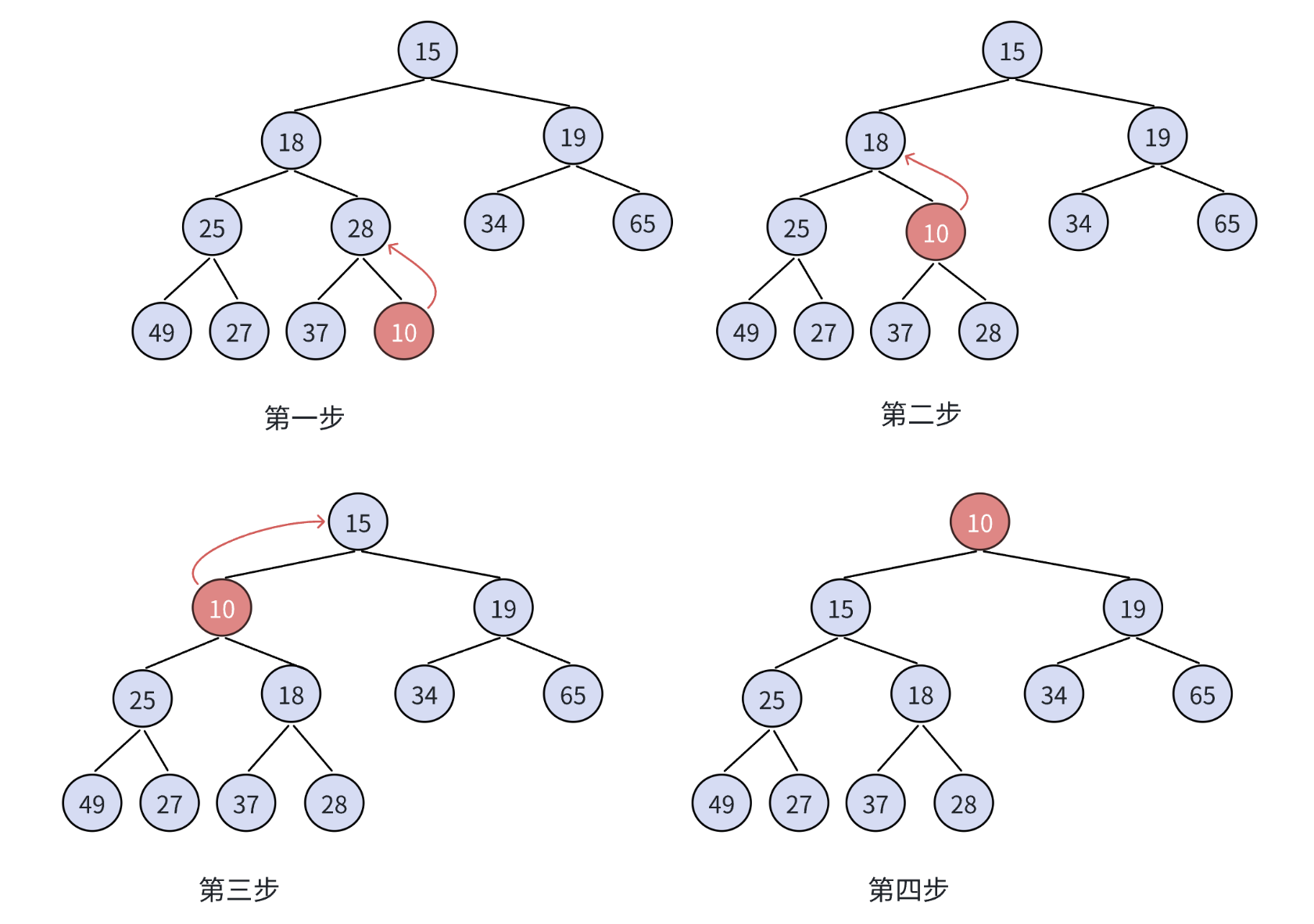 向上调整算法在向堆中插入数据的时候使用:• 先将元素插⼊到堆的末尾,即最后⼀个孩⼦之后。• 插⼊之后如果堆的性质遭到破坏,将新插⼊结点顺着其双双亲往上调整到合适位置即可。