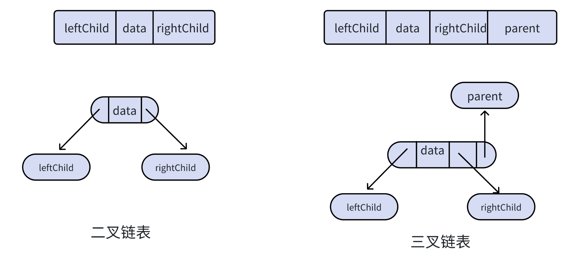 ⼆叉树的链式存储结构是指,用 链表 来表示⼀棵⼆叉树,即⽤链来指⽰元素的逻辑关系。 通常的⽅法是链表中每个结点由三个域组成,数据域和左右指针域,左右指针分别⽤来给出该结点左孩⼦和右孩⼦所在的链结点的存储地址 。链式结构⼜分为⼆叉链和三叉链。 当前我们学习中⼀般都是⼆叉链。后 ⾯课程学到⾼阶数据结构如红⿊树等会⽤到三叉链。