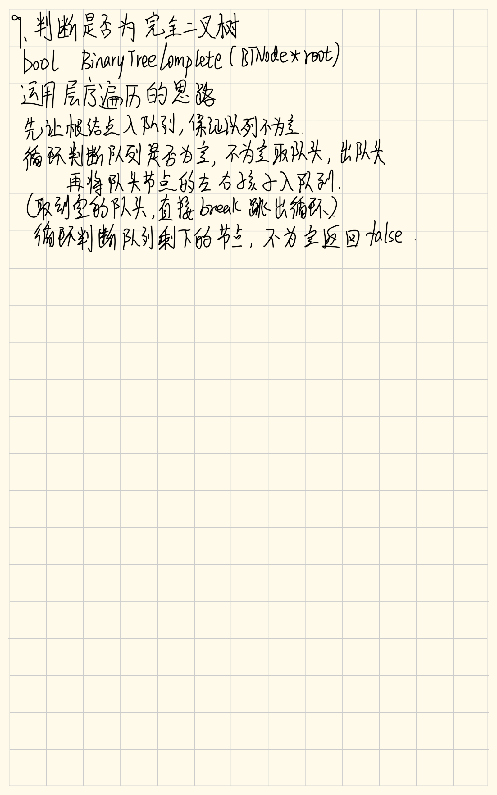 实现方法:先让根节点入队列,保证队列不为空,然后循环判断队列是否为空,不为空进入循环:取队头,(不为空就继续,为空就break跳出循环)出队头,让队头的左右孩子节点入队列。取到空的队头跳出循环,循环判断队列不为空进入循环:队头是否为空,不为空就直接返回fasle,否则出循环后返回true。
