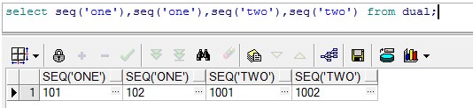 select seq('one'),seq('one'),seq('two'),seq('two') from dual;