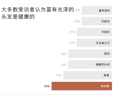 受访者将健康头发描述为富有光泽(36%)和顺滑(29%),并认为健康的头发与健康的头皮有关(26%)