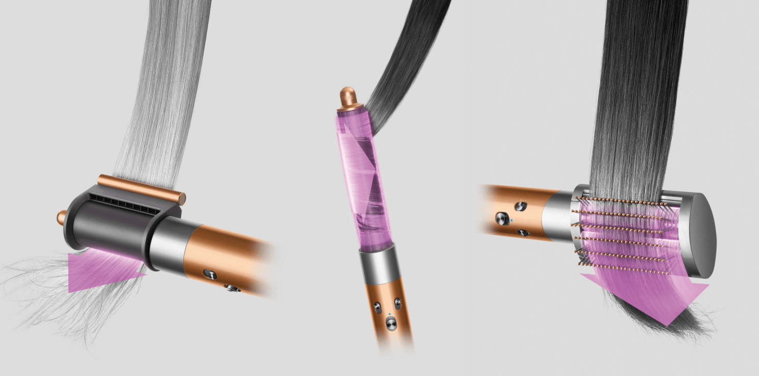 同时,“康达效应”还被戴森运用到其他头发护理品类的产品中,例如,戴森新一代Airwrap™多功能造型器,就是利用高速的戴森第九代数码马达驱动 “康达效应”,帮助实现卷发、顺发和干发,但无需过高的温度。