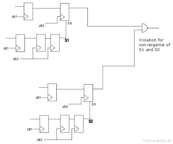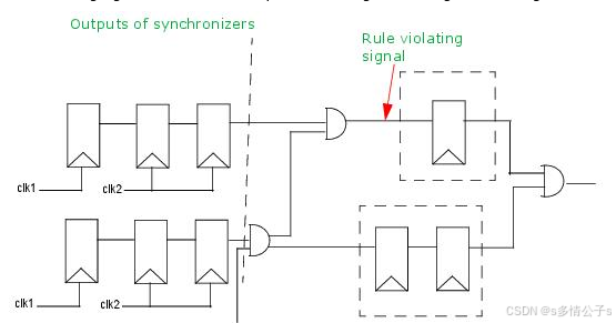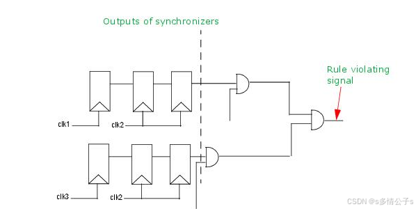 如下图,不同信号经过同步器后又经过不同数量的寄存器,最终在同一个逻辑门处聚合。
