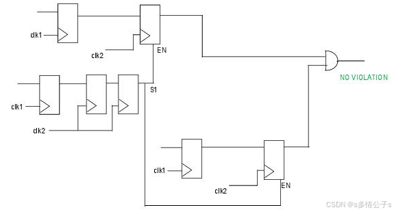 同一个信号经过多个同步器后又经过不同数量的寄存器,最终在同一个逻辑门处聚合。这种情况与上述情况类似。如下图。