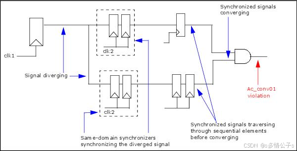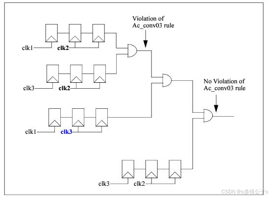 AC_conv01规则报告来自同一域的信号,这些信号在同一目标域中同步,并在任意数量的时序单元后聚合。即信号经过同步器+寄存器后聚合违例。