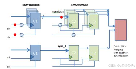 如下图,同一信号经过同步器后在同一个时序单元前聚合(后面的时序单元未画出)。