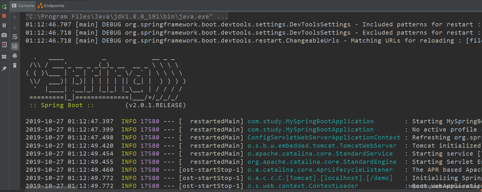 执行SpringBoot起步类的主方法(带有 @SpringBootApplication标签的类),控制台打印日志如下 :