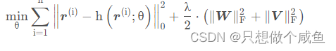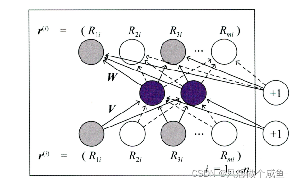 图中的V 和W 分别表示输入层到隐层, 隐层到输出层的参数矩阵, 如果熟悉神经网络的计算, 这个模型的重构函数表示: