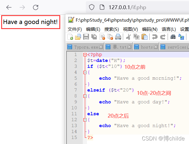 如果当前时间小于 10,下面的实例将输出 "Have a good morning!",如果当前时间不小于 10 且小于 20,则输出 "Have a good day!",否则输出 "Have a good night!":