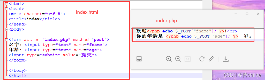 当用户填写完上面的表单并点击提交按钮时,表单的数据会被送往名为 "index.php" 的 PHP 文件: