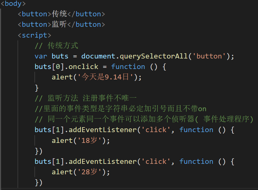 注册事件有两种方式:传统方式和方法监听注册方式