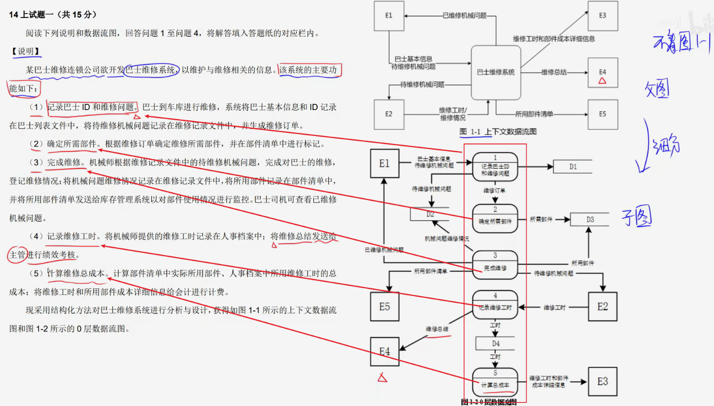 | 缺失数据流补充 | 每年必考 | 父图子图平衡、加工完整性、题干匹配 | 2014年巴士维修系统(补充“维修情况”数据流) |