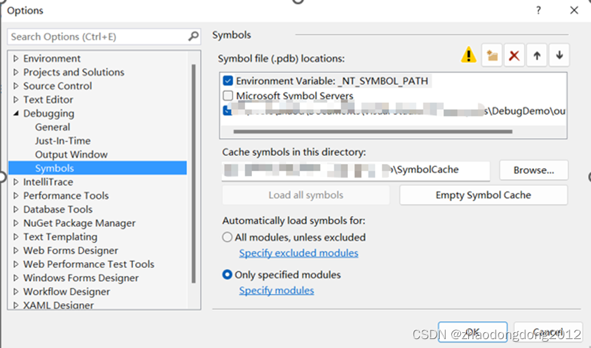 7、配置pdb路径(debug->Options->Debugging->Symbols)