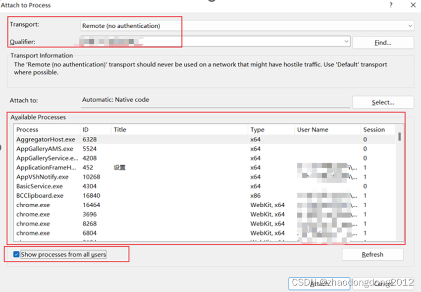5、调试->Attach to Process->Transport :Romote,填写服务器IP(端口默认4020)