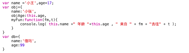 obj.myFun.call(db); // 德玛年龄 99 obj.myFun.apply(db); // 德玛年龄 99 obj.myFun.bind(db)(); // 德玛年龄 99