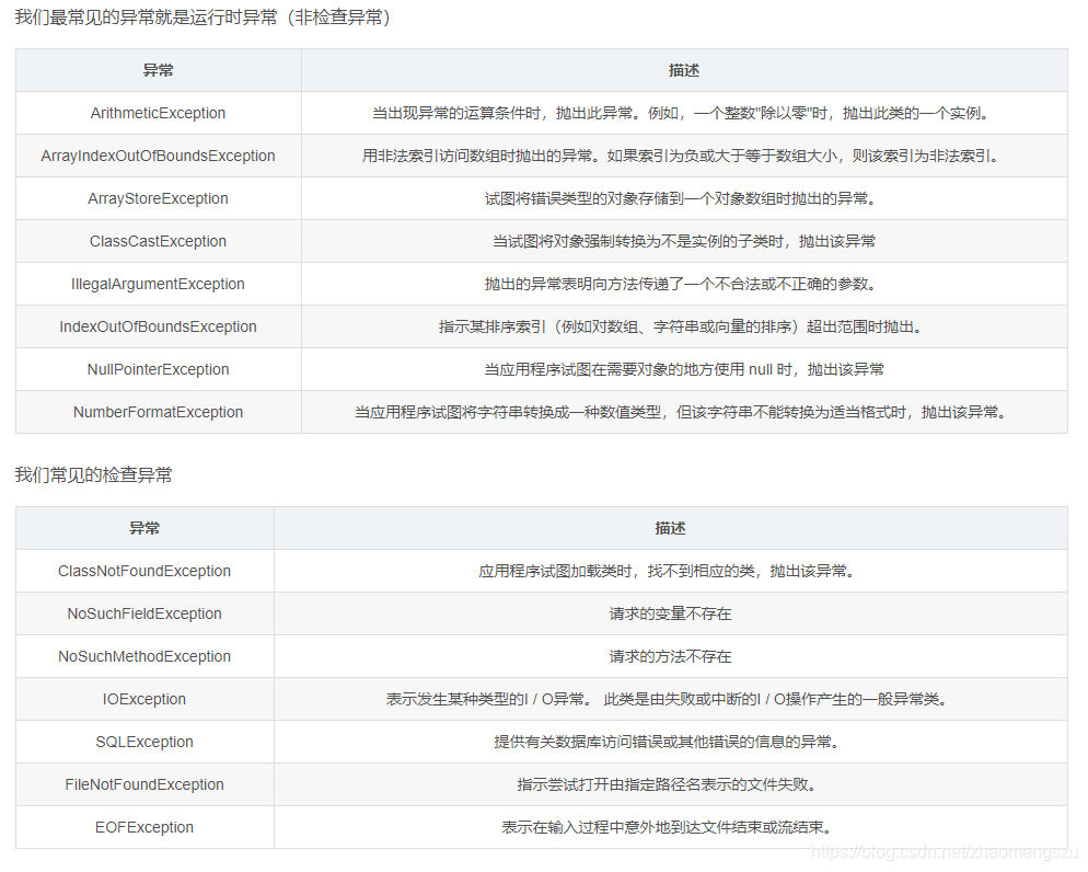Exception及其子类是 Throwable 的一种形式,它指出了合理的应用程序想要捕获的条件。
