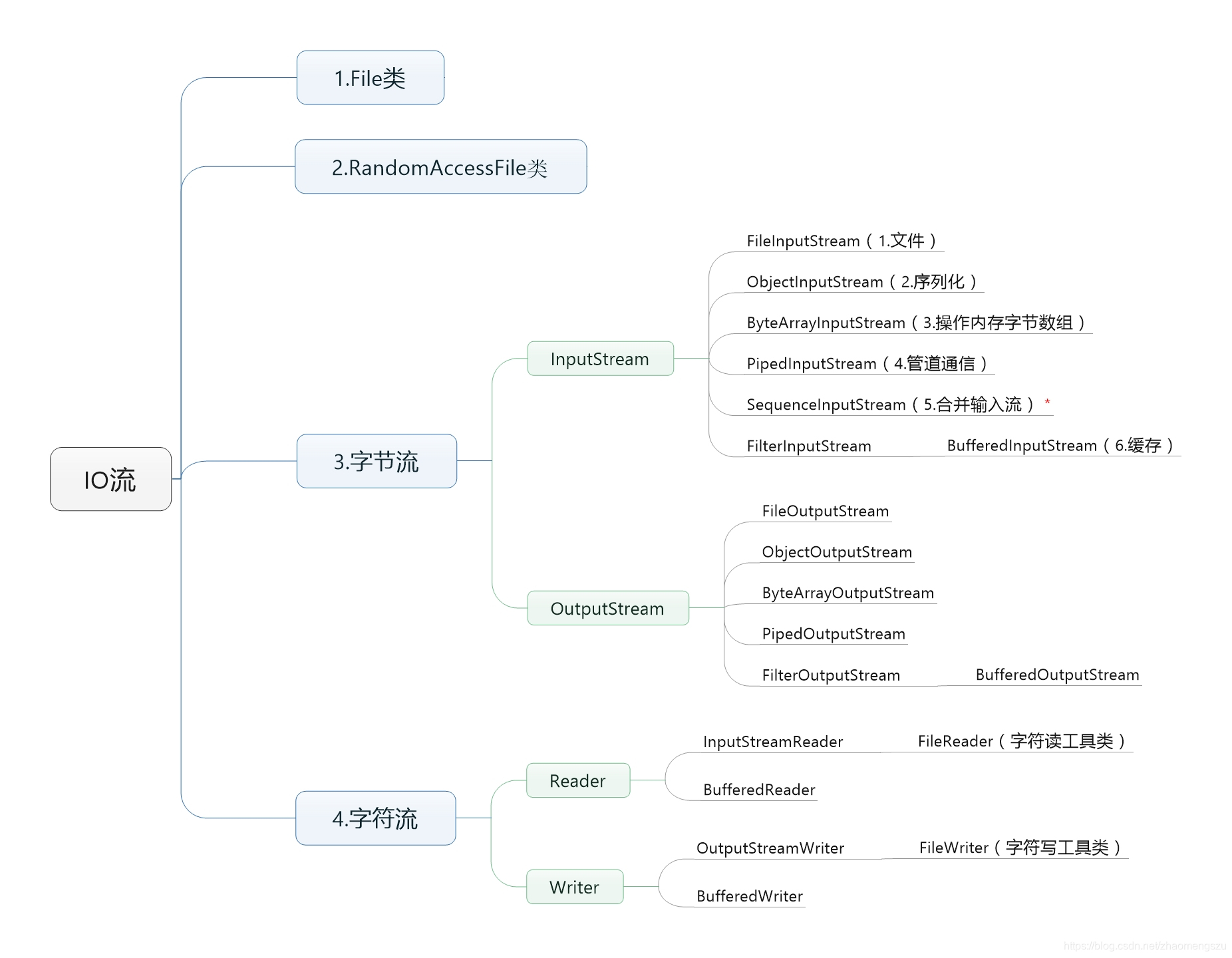 在java.io包中操作文件内容的主要有两大类:字节流、字符流,两类都分为输入和输出操作。在字节流中输出数据主要是使用OutputStream完成,输入使的是InputStream,在字符流中输出主要是使用Writer类完成,输入流主要使用Reader类完成。(这四个都是抽象类)。