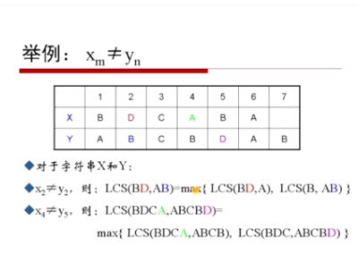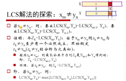 当我们认为是我们子序列的子串的最后一个元素不相等,那么他的最长子序列一定来自两个地方,假设去掉X序列的最后一个元素,那么最长子序列一定产生于图中A+B+Yn,同理一样, B+A+Xn.