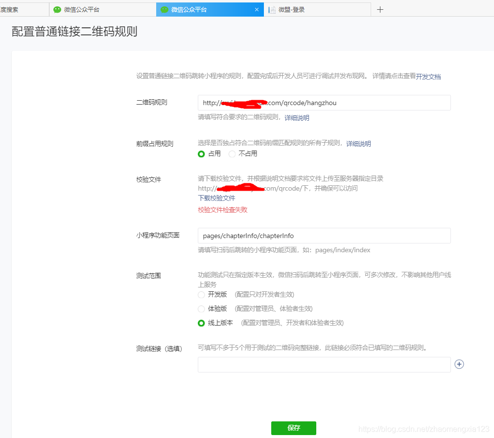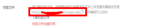 第二步,点击上图 扫普通链接二维码打开小程序 出添加按钮,信息按照开发文档规则配置好之后,点击保存,报如下图校验文件检查失败。
