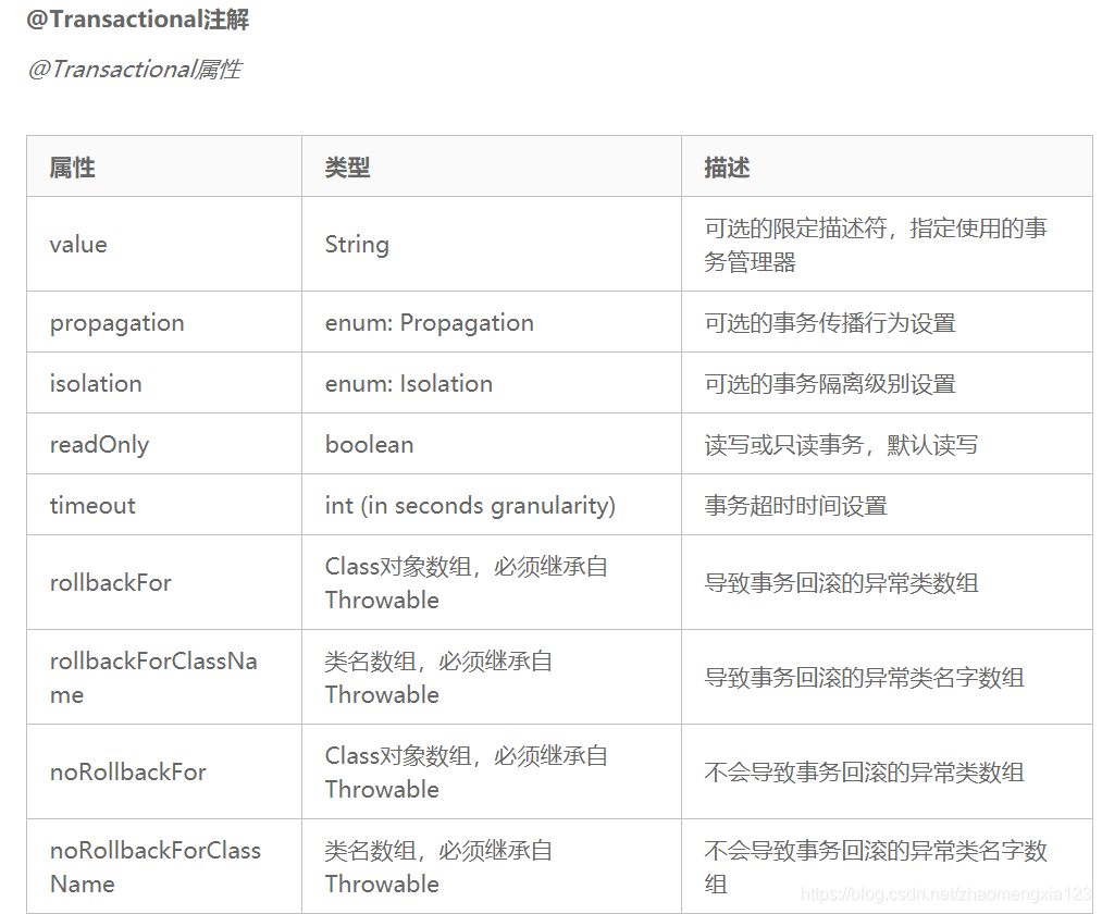 @Transactional可以用于接口、接口方法、类及类方法上。当作用于类上时,该类的所有public方法将都具有该类型的事务属性,同时,我们也可以在方法级别使用该标注来覆盖类级别的定义。