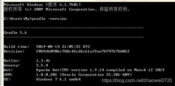 - 验证,win+R,输入cmd进入命令行,然后输入gradle -version,如下图提示证明安装成功