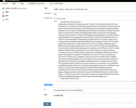 在确保客户端机器可以免密访问目标机器后,需要将客户端的私钥配置到jenkins的“凭据”中: