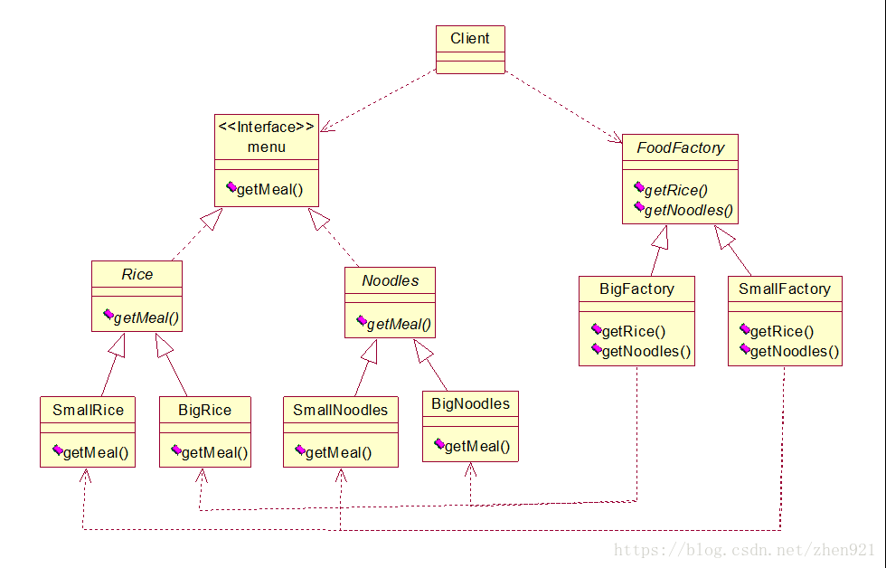 - 实例中类图较多,容易混淆,但看着类图把脉络搞清就能理解,本例中,我们把米饭和面条两种产品做了抽象处理,让子类实现,并且做出大碗小碗,而两个具体工厂一个负责大碗对象的创建,一个负责小碗对象的创建。