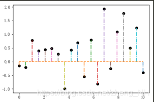 函数:plt.stem(x,y, linefmt=None, markerfmt=None, basefmt=None)