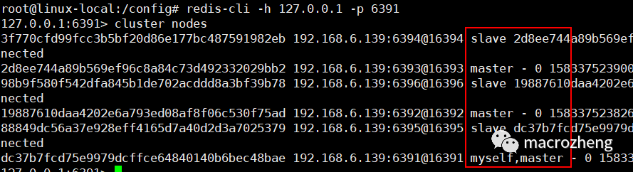 cluster nodes命令可以查看节点信息,发现符合原来3主3从的预期。