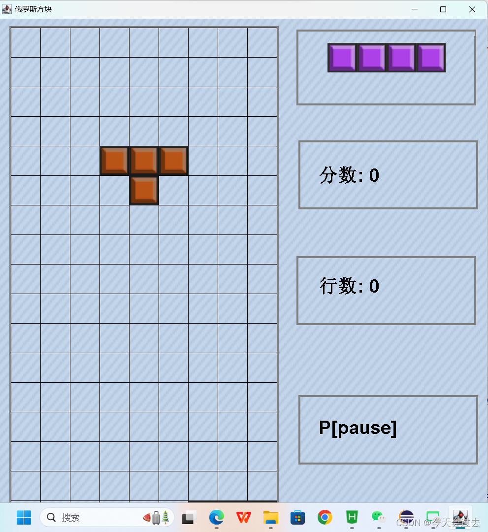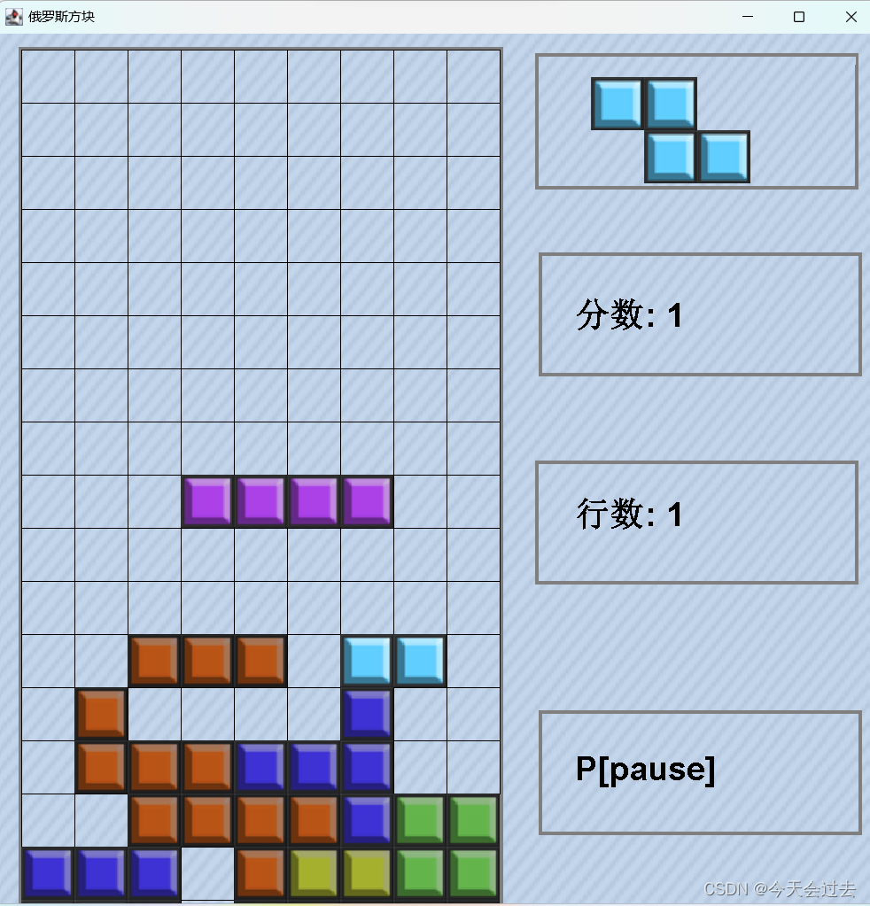 按下空格键,方块瞬间下落, 按下P键游戏暂停,消除一行分数为1(此处由分数池进行控制)