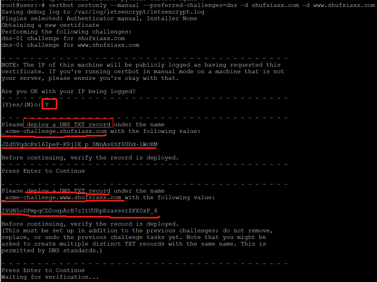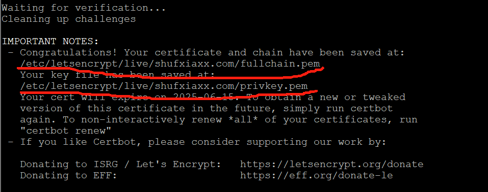 一旦 DNS 记录生效,Certbot 会自动完成验证过程,并生成SSL证书