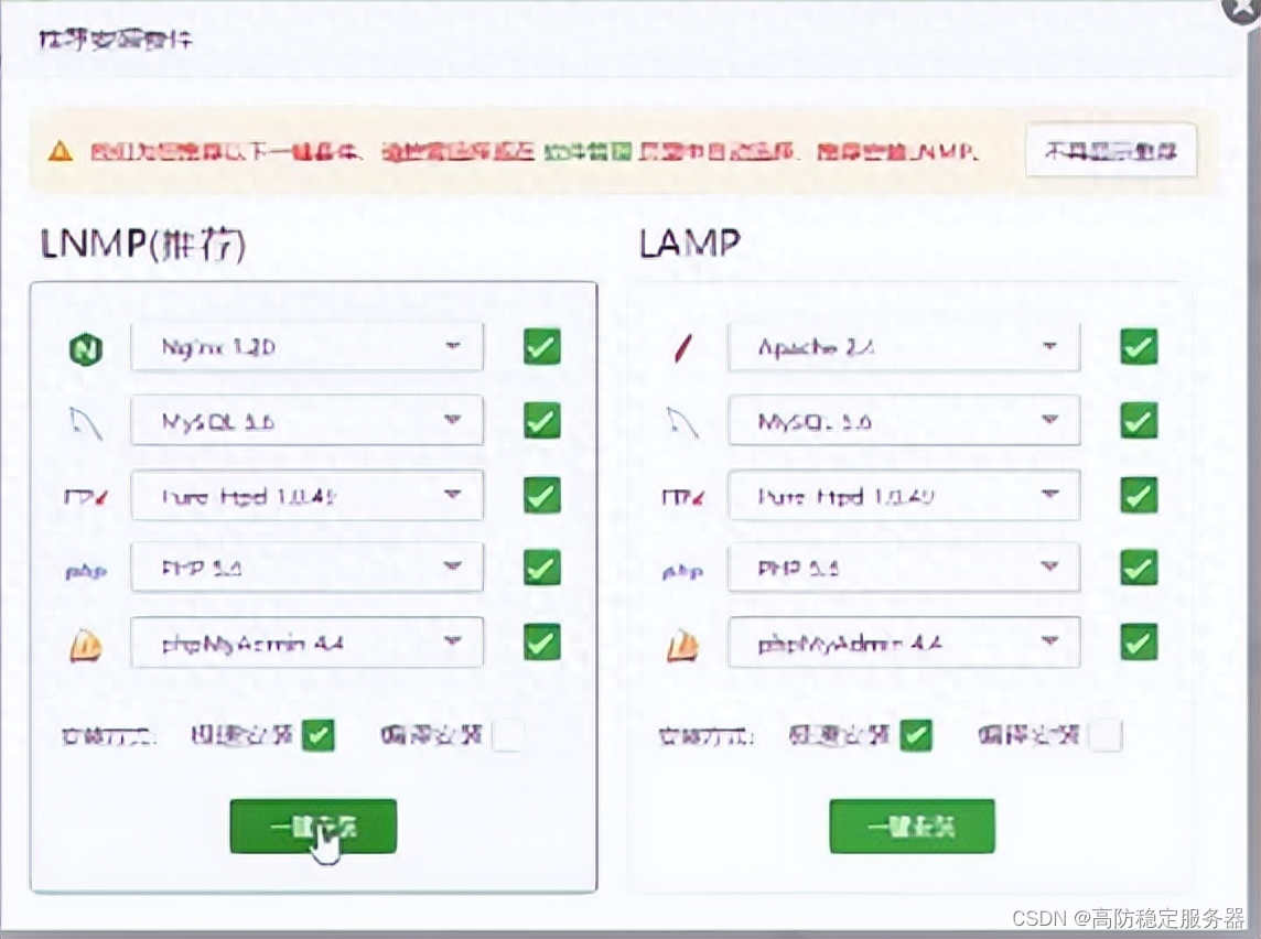 - 进入宝塔需要绑定你的宝塔账号,进入之后在弹出的推荐中选择第一个,这也是网站运行的基础环境软件。