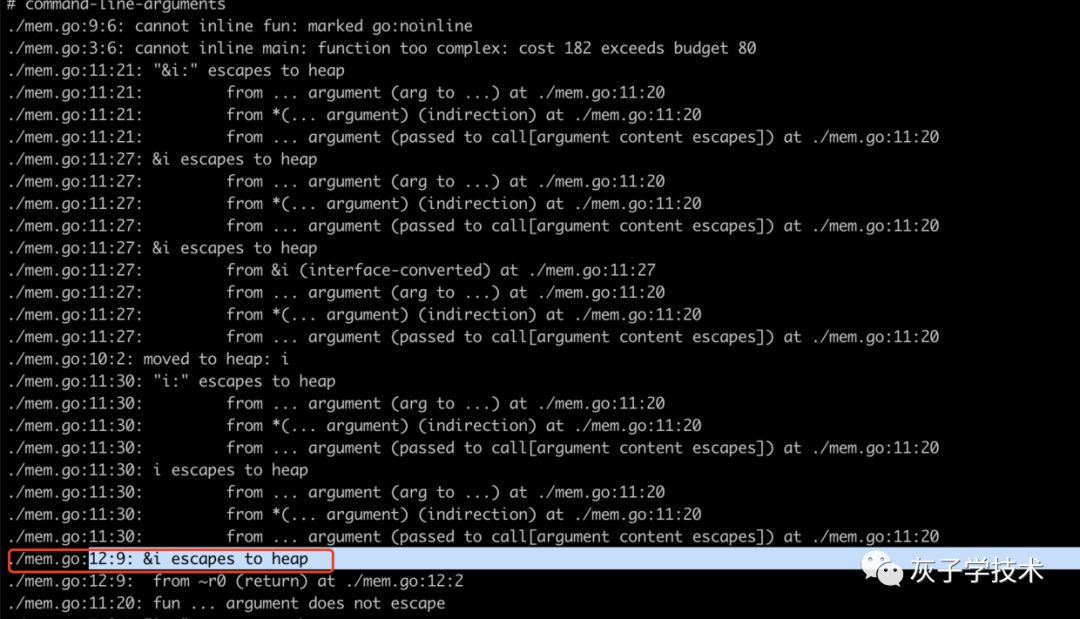 执行$ go build -gcflags "-m -m" mem.go 会得到下面的分析结果: