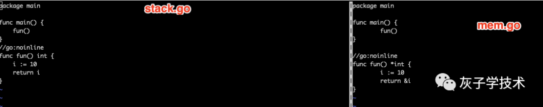 例子2:mem.go的fun()返回的是*int变量,同时里面的返回值是&i。