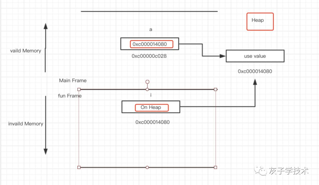 3.main函数在调用fun()之后,会copy一份i的值给变量a,此时的a的地址是0xc0000c028,存的值是i的地址0xc000014080,这个地址在堆中。