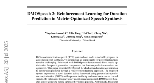 Q1:DMOSpeech 2是什么?它主要解决了什么问题? A:DMOSpeech 2是哥伦比亚大学开发的新一代AI语音合成系统。它主要解决了现有语音合成系统中时长预测不准确的问题,通过强化学习让AI学会更好地控制说话节奏和停顿,使合成的语音听起来更自然、更像真人说话。