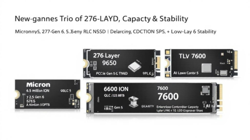 美光公司发布了三款面向不同市场的SSD产品。9650是一款采用TLC(3位/单元)闪存的PCIe Gen 6 SSD,专为高速性能而设计。6600 ION是一款高容量驱动器,容量达122.88 TB,采用PCIe Gen 5接口和较慢的QLC(4位/单元)闪存。第三款驱动器7600同样采用PCIe Gen 5 TLC技术,专为1.6-15.36 TB容量范围内的一致低延迟而设计。三款产品均采用最新的第9代276层3D NAND技术,并配备美光自主研发的DRAM、NAND、控制器和固件。