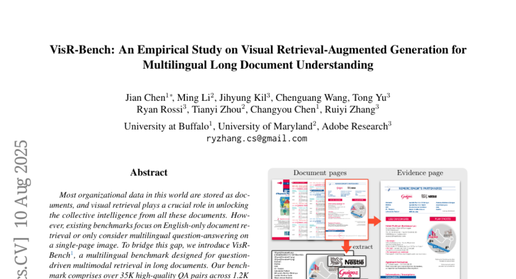 这项由美国斯坦福大学、马里兰大学以及Adobe Research联合开展的研究于2025年8月发表,论文标题为《VisR-Bench: An Empirical Study on Visual Retrieval-Augmented Generation for Multilingual Long Document Understanding》。研究团队包括来自Buffalo大学的Jian Chen、马里兰大学的Ming Li和Tianyi Zhou、Adobe Research的Jihyung Kil、Tong Yu、Ryan Rossi和Ruiyi Zhang等知名学者。完整论文可通过arXiv:2508.07493v1访问,为理解多语言视觉检索技术的最新进展提供了宝贵参考。
