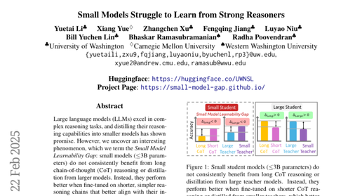 这项由华盛顿大学李悦泰等研究者领导的研究发表于2025年2月,论文标题为《Small Models Struggle to Learn from Strong Reasoners》。研究团队包括来自华盛顿大学、卡内基梅隆大学和西华盛顿大学的多位学者,有兴趣深入了解的读者可以通过论文项目页面 Small Models Struggle to Learn from Strong Reasoners 或Hugging Face平台 https://huggingface.co/UWNSL 访问相关资源。