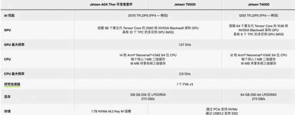 Jetson Thor(开发者套件)提供Jetson T5000(旗舰级)和Jetson T4000(高阶性能)两款核心模块。