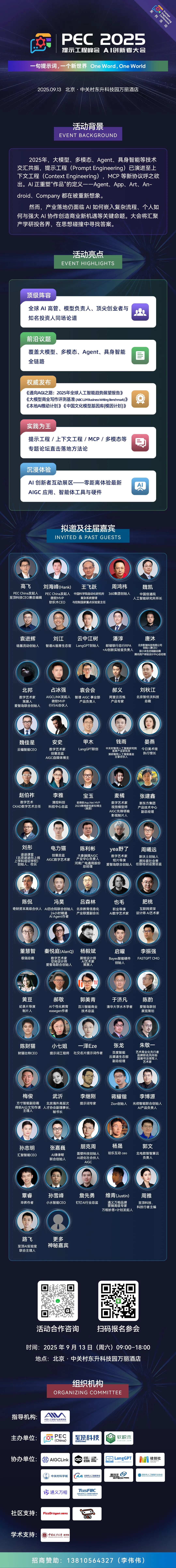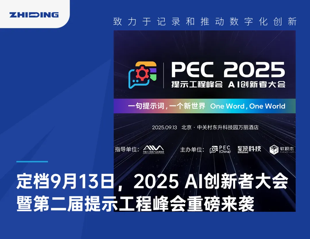 面对这些新时代的新问题,2025年9月13日,“2025 AI创新者大会暨第二届提示工程峰会”将在北京召开。本届大会由中国人工智能产业发展联盟指导,PEC China、至顶科技、软积木共同主办,中关村科学城、漕河泾开发区总公司、天津市人工智能学会、深圳市人工智能行业协会、启迪大街亦庄人工智能联合创新中心、通义万相、AIGCLink、爱智岛(AI·DAO)人工智能创作联盟、LangGPT、硅创社协办,并有ComfyUI 全球社区(CCS)、中国政法大学商学院、沸腾宇宙等诸多顶尖AI社区、学术机构鼎力支持,凝聚共识,擘画AI未来。