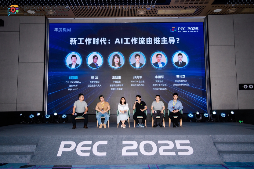会上“年度提问二:新工作时代:AI工作流由谁主导?”由PEC China发起人、微软MVP、软积木CEO刘海峰主持。来自企业与技术前沿的代表齐聚一堂:百度智能云创企生态负责人张龙、中国联通智慧足迹副总裁、首席经济学家王旭阳、NVIDIA企业级软件生态负责人张海军、百望股份数字经济与金融科技研究院院长李国平,以及华硕电脑AIoT战略合作伙伴总监蔡裕正,从企业实践到技术实现、从业务落地到战略决策,展开了一场高密度的思想碰撞与经验分享,将AI工作流背后的难题和解决路径彻底揭开。
