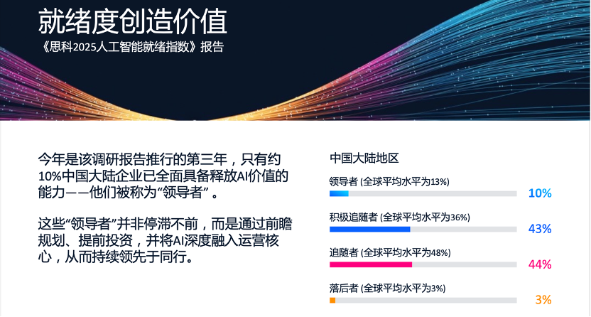 只有约10%中国大陆企业已全面具备释放AI价值的能力,他们将AI从试点阶段推向正式应用的可能性是其他中国大陆企业的4倍,并且他们实现可量化AI价值的可能性高出50%。