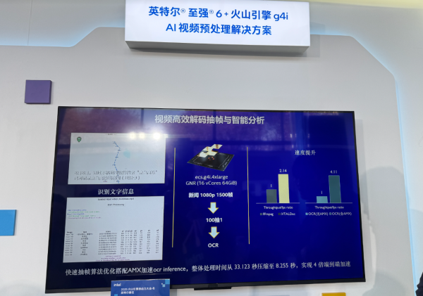 我们在大会现场的英特尔展台上,看到了基于英特尔至强6+火山引擎g4i的AI视频处理解决方案。