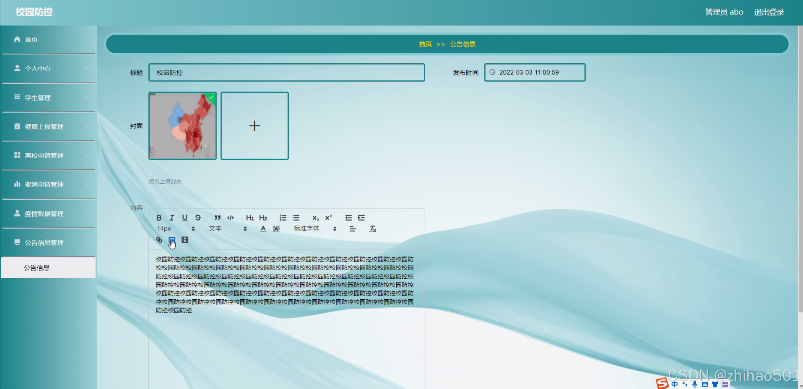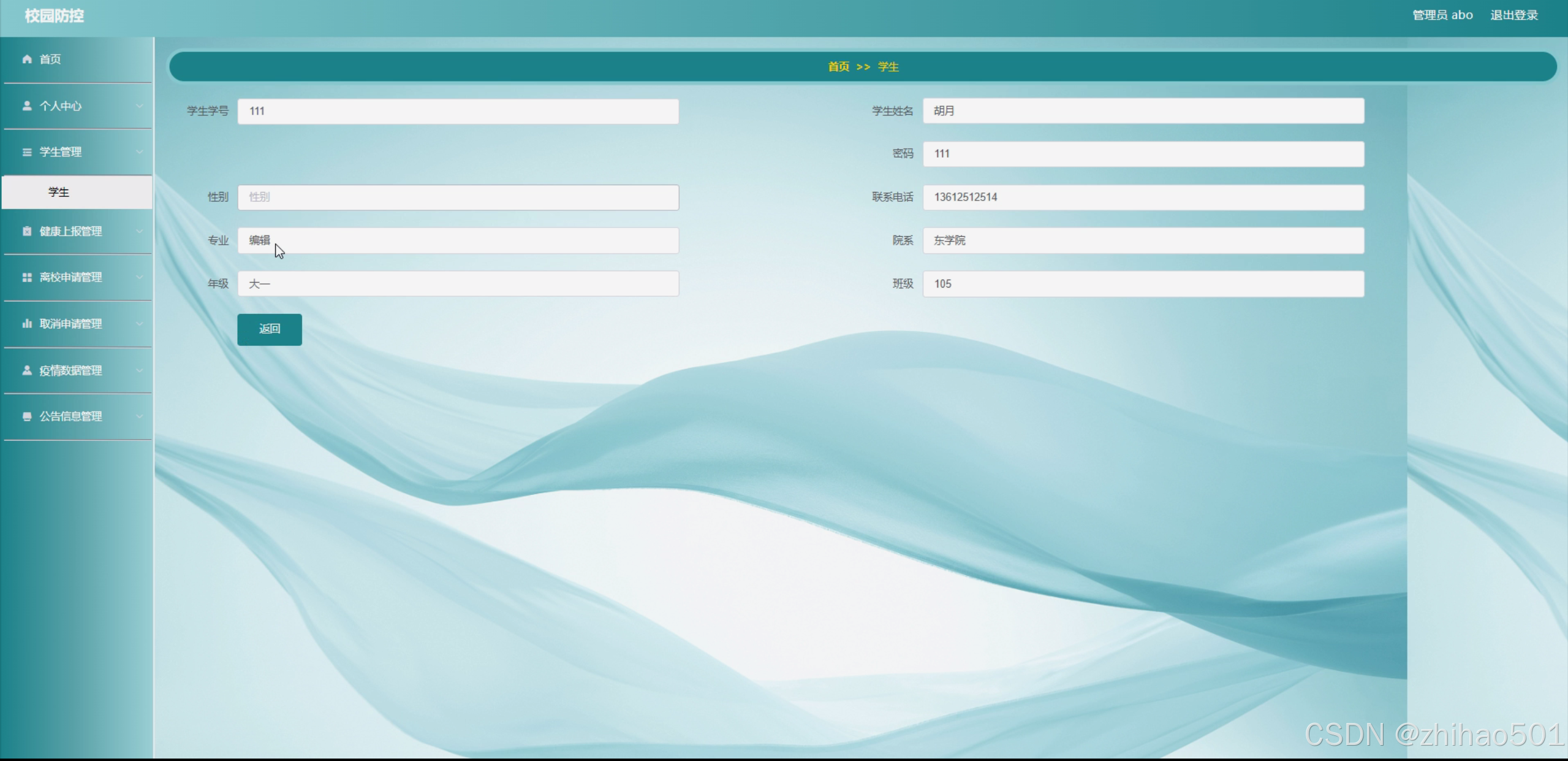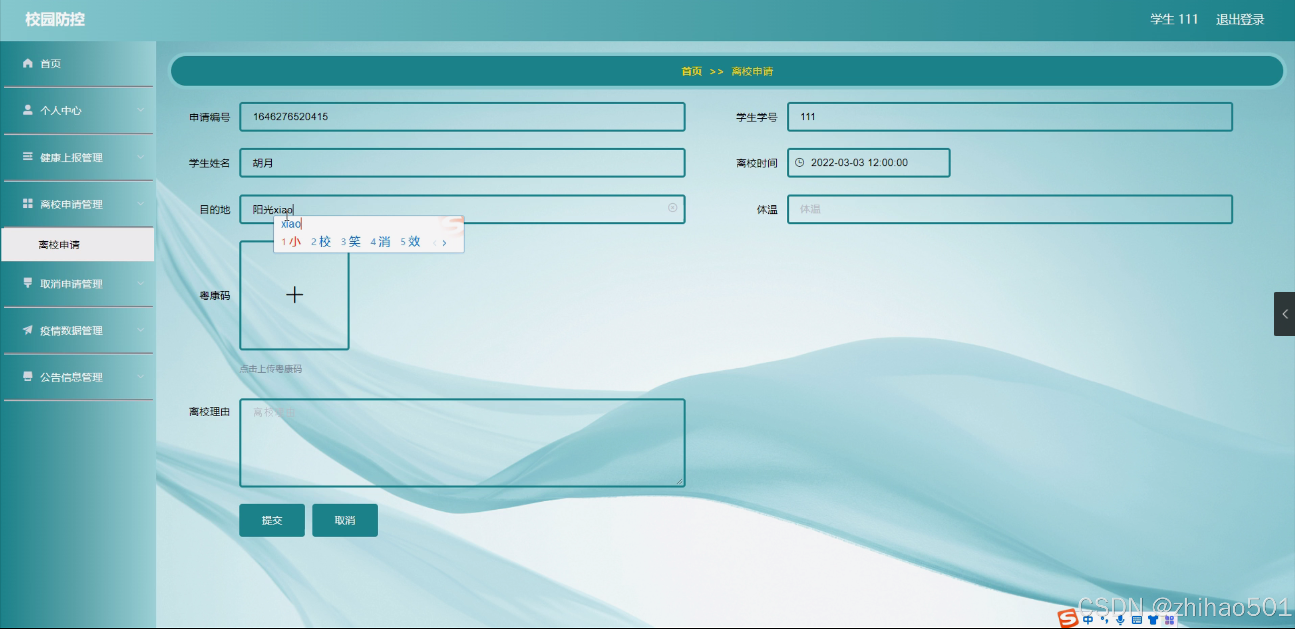 本研究将围绕校园防控系统的功能展开,具体包括:学生信息管理模块,实现学生基本信息的录入、更新与查询;健康上报模块,允许学生每日上报健康状况,系统自动汇总分析;离校申请与审批模块,学生提交离校申请,教师或管理人员进行审批;公告信息发布模块,实时发布疫情防控政策、通知等信息;取消申请模块,允许学生取消已提交的离校申请;疫情数据展示模块,展示校园内疫情数据,如确诊人数、隔离人数等。通过这些功能模块的设计与优化,构建一个高效、实用的校园防控系统。