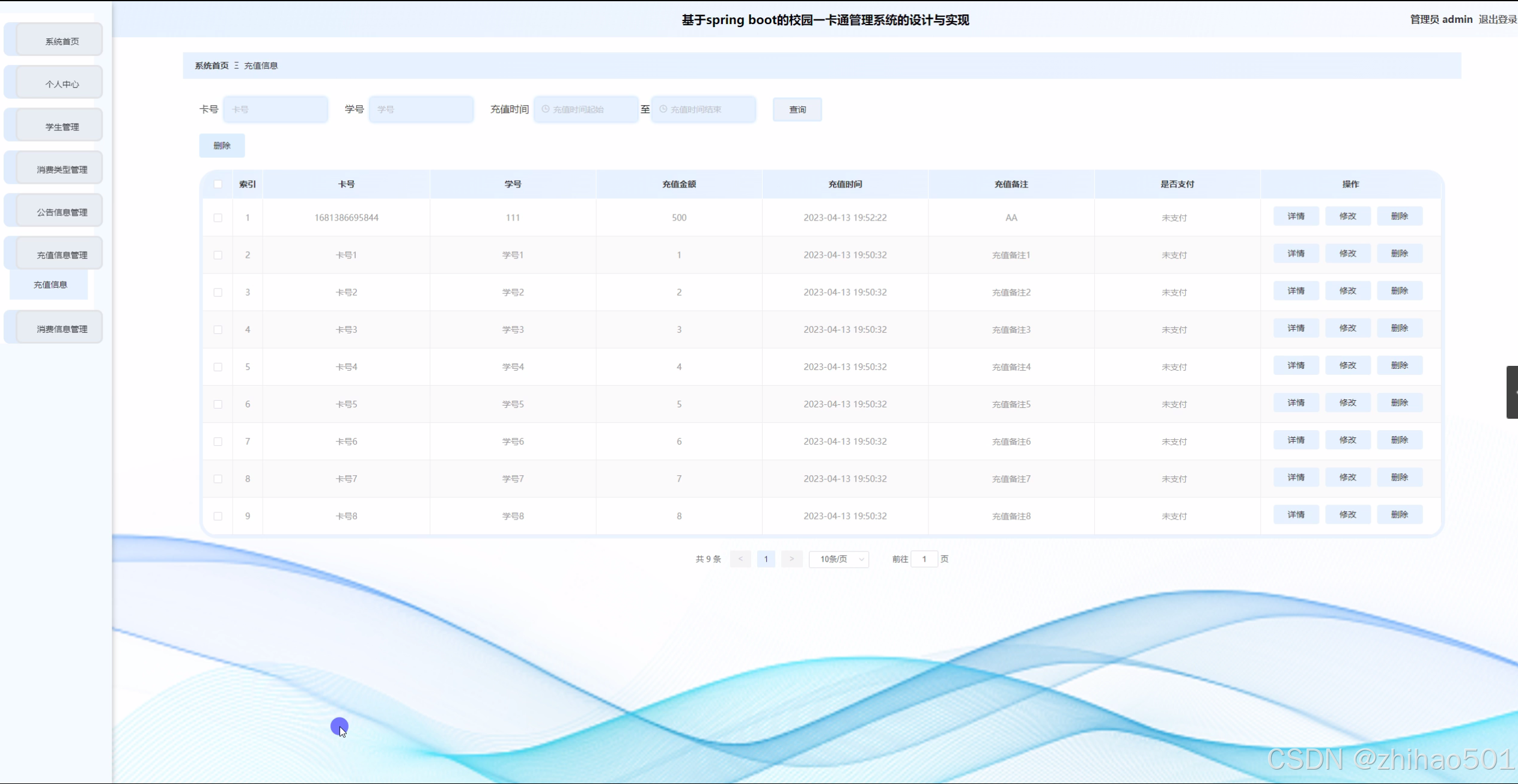- 充值信息管理模块:实现充值记录的录入、查询、统计等功能,方便学生随时查看充值情况和余额变动。