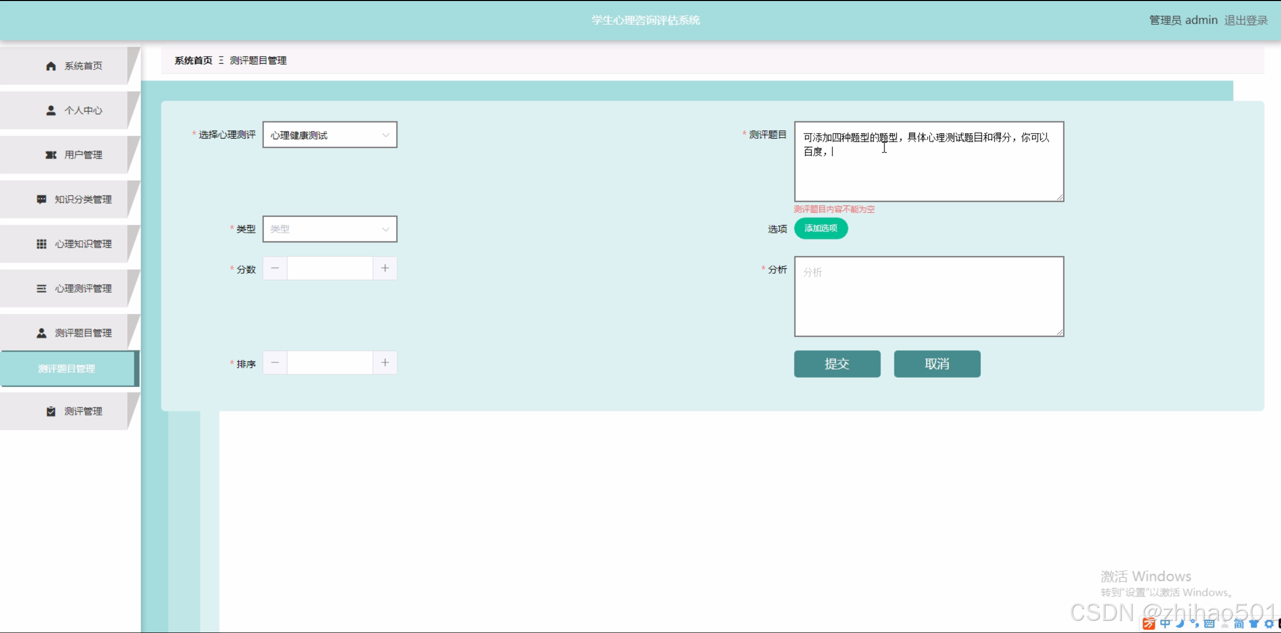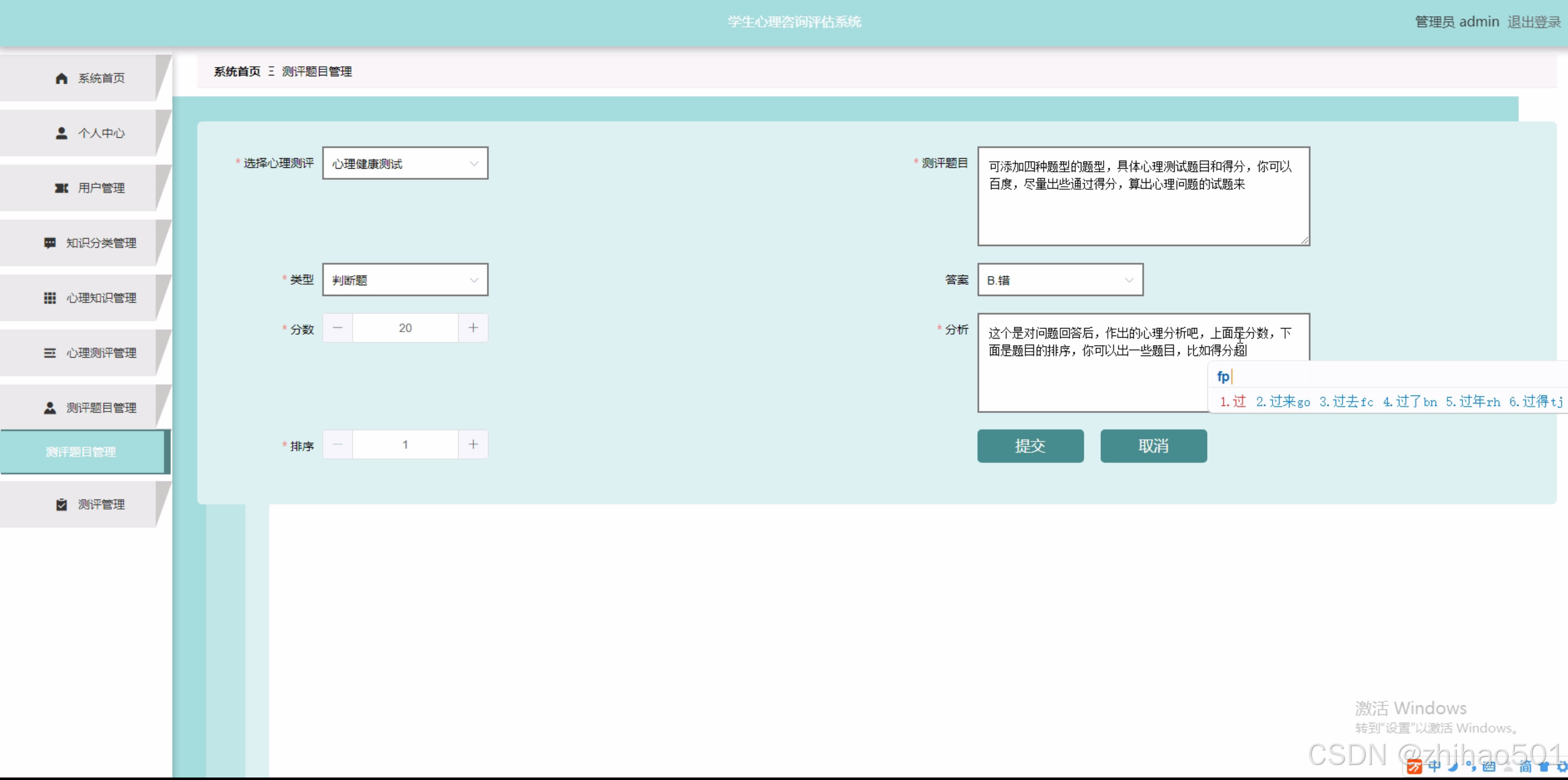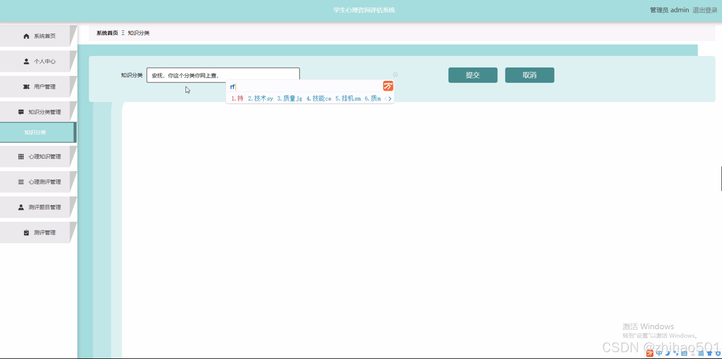本研究内容主要包括五个方面:一是用户模块的设计,考虑学生、教师、心理咨询师等不同用户角色的需求;二是知识分类体系的建立,对心理知识进行系统化整理;三是心理知识库的构建,涵盖常见心理问题、解决方法等;四是在线咨询功能的实现,提供实时、高效的在线咨询服务;五是评测标准的制定,确保心理评估的准确性和有效性。通过这些研究内容,旨在构建一个全面、实用的学生心理咨询评估系统。