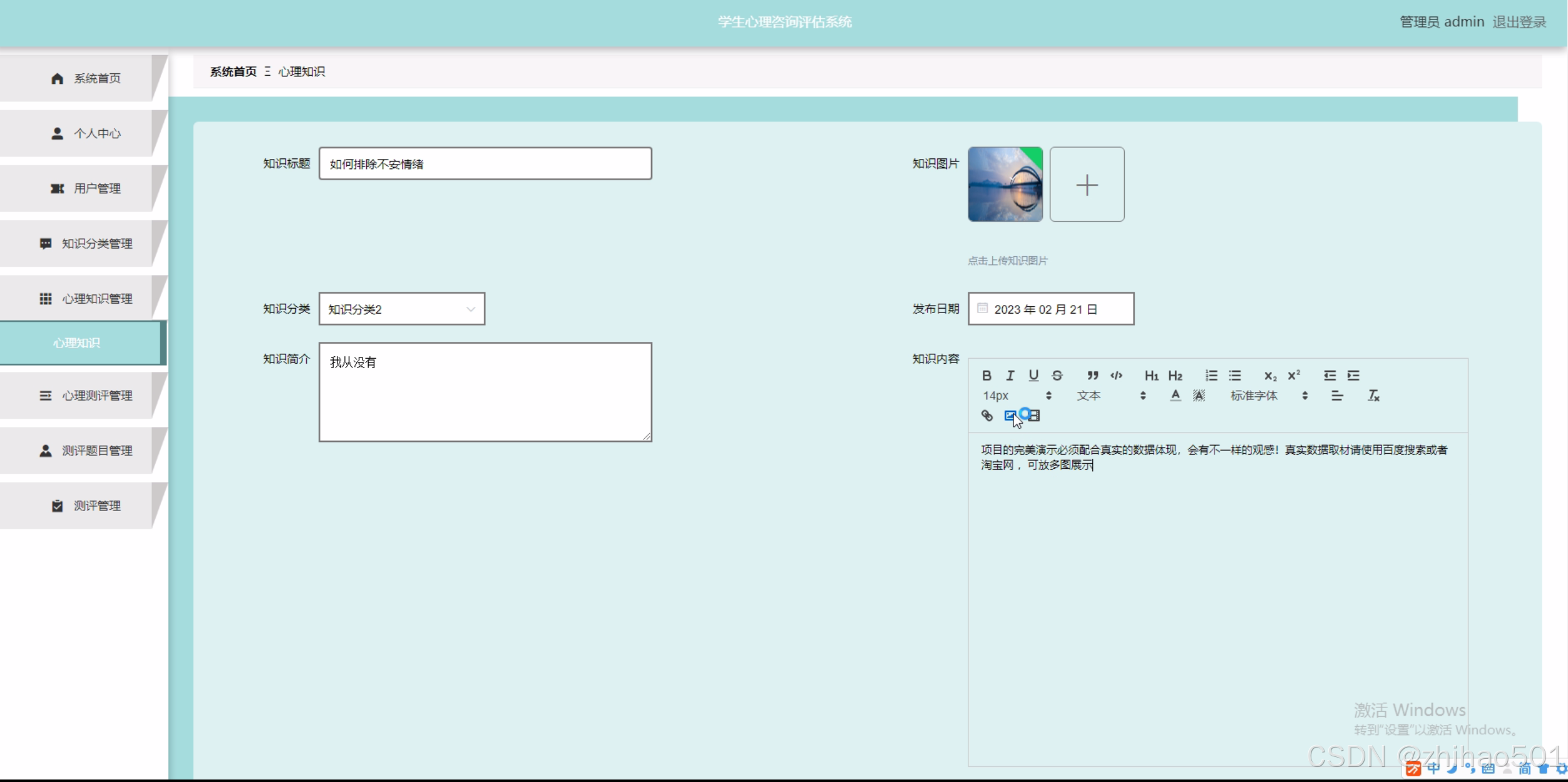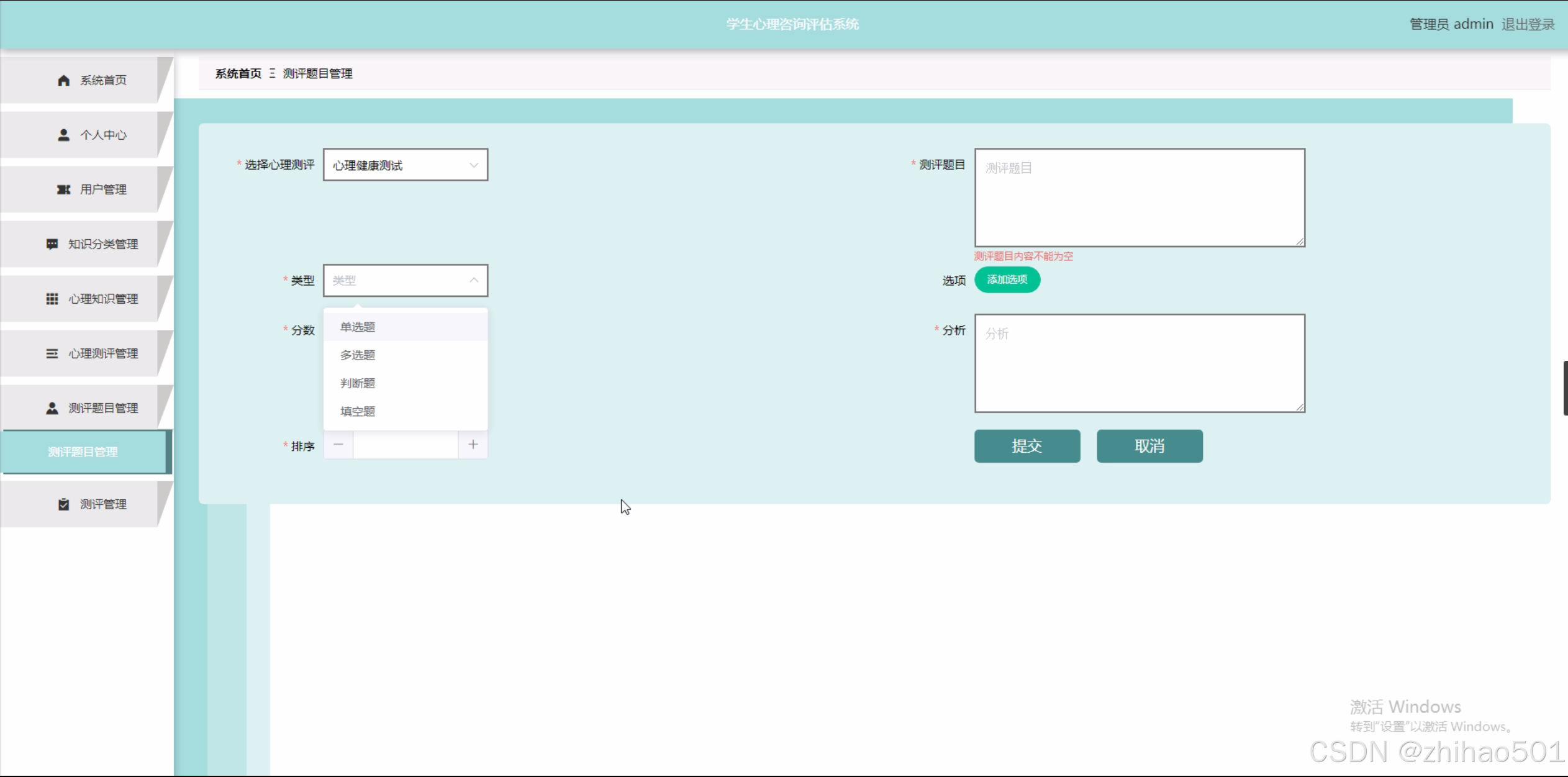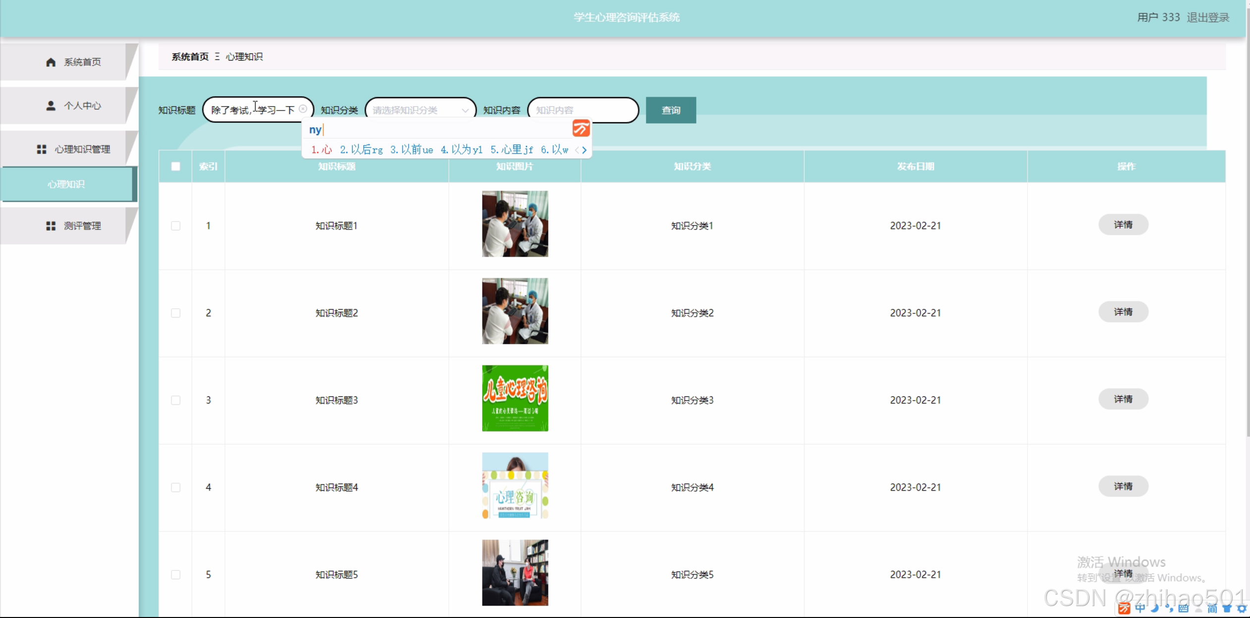 本研究内容主要包括五个方面:一是用户模块的设计,考虑学生、教师、心理咨询师等不同用户角色的需求;二是知识分类体系的建立,对心理知识进行系统化整理;三是心理知识库的构建,涵盖常见心理问题、解决方法等;四是在线咨询功能的实现,提供实时、高效的在线咨询服务;五是评测标准的制定,确保心理评估的准确性和有效性。通过这些研究内容,旨在构建一个全面、实用的学生心理咨询评估系统。
