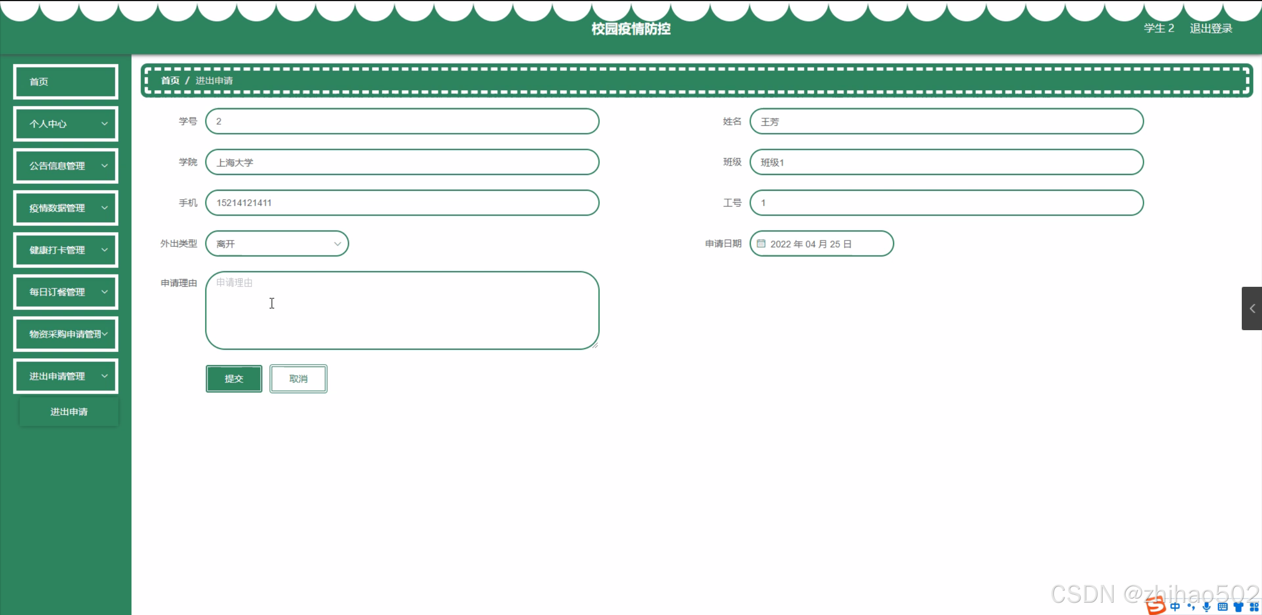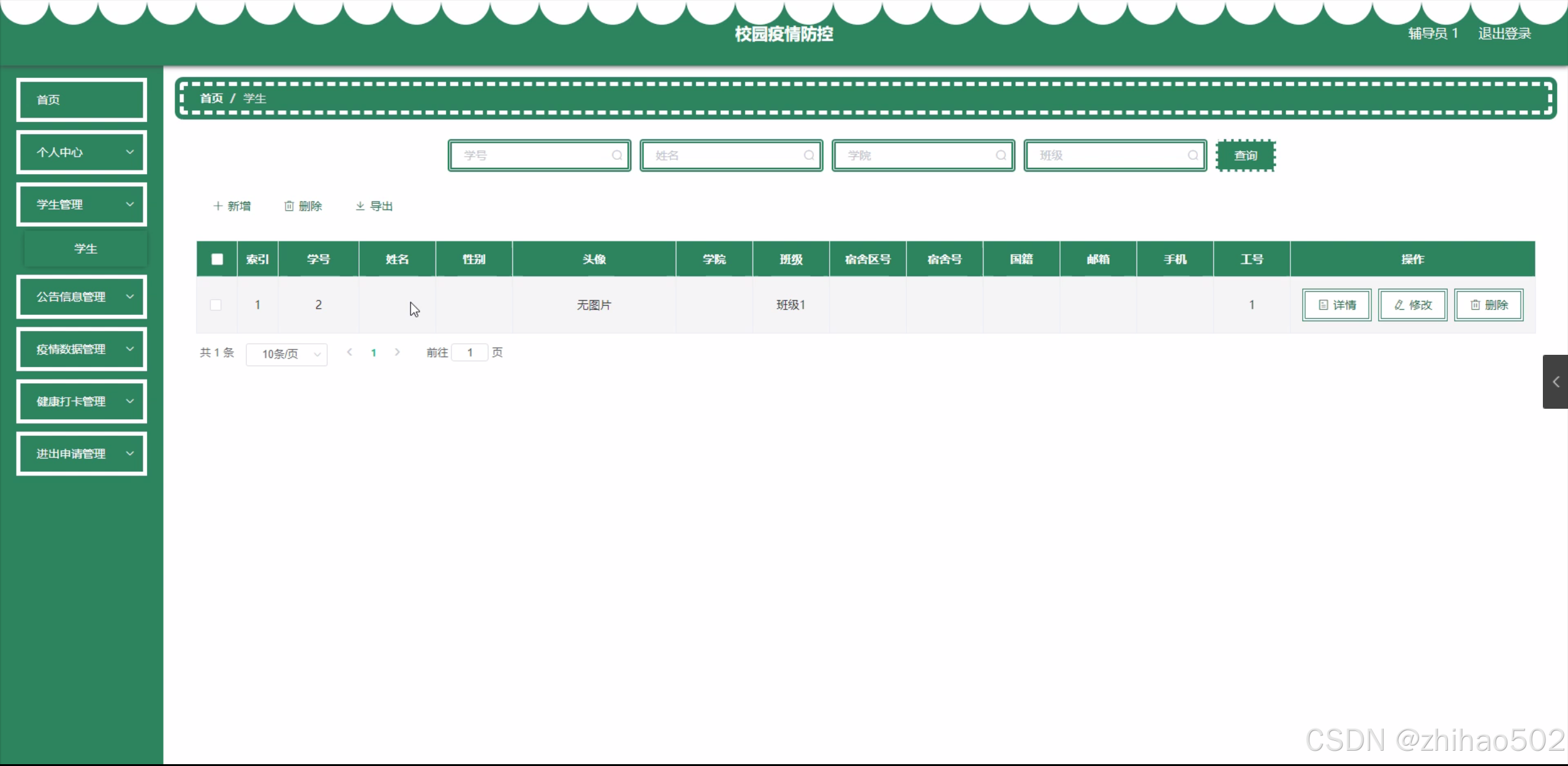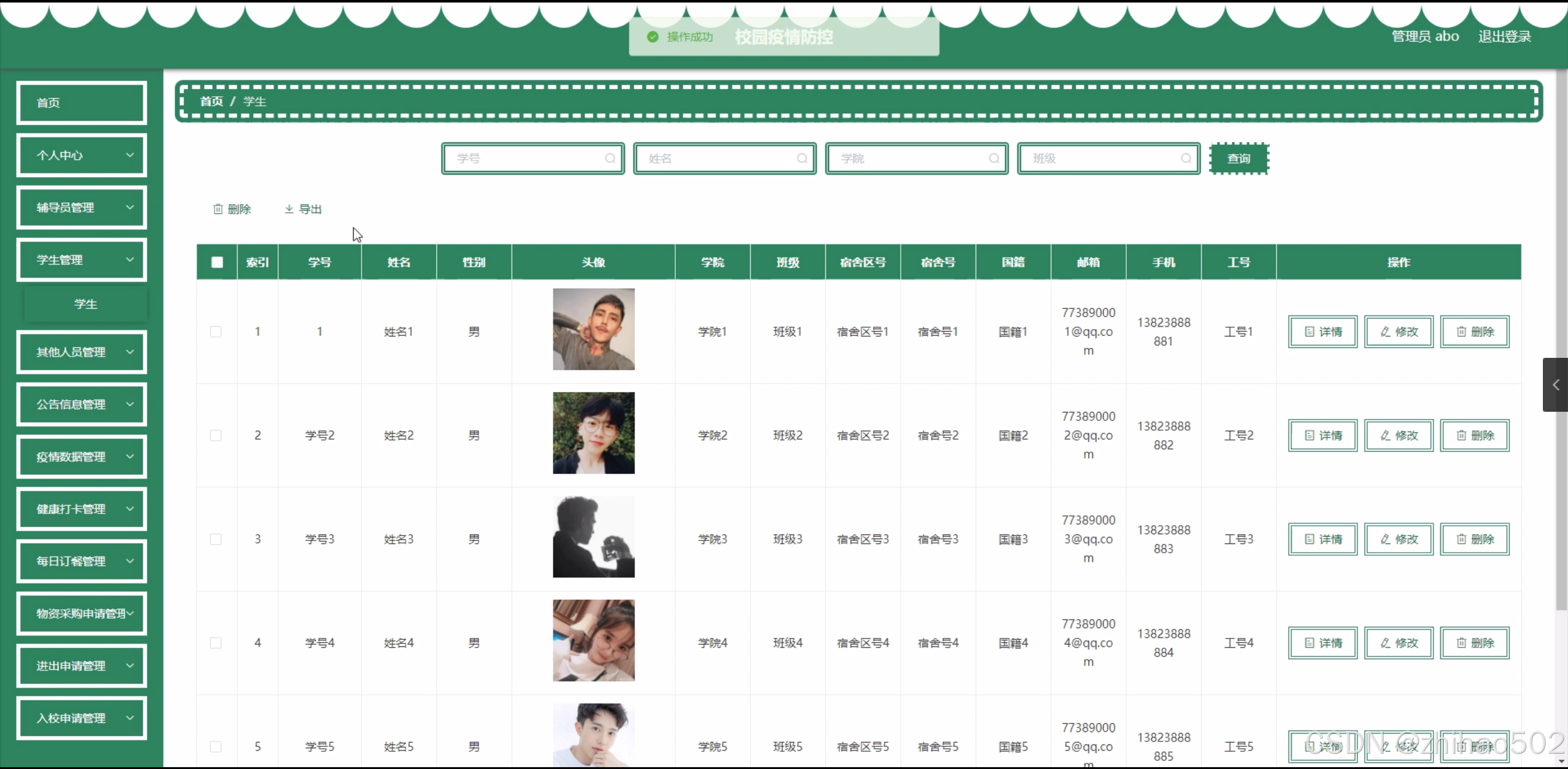 本研究将围绕校园疫情防控的系统功能展开,具体包括辅导员、学生、其他人员的管理功能,公告信息的发布功能,国内疫情和世界疫情的监测功能,健康打卡的监管功能,每日订餐、物资采购申请、进出申请、入校申请的审批功能,以及健康行程码的校验功能等。通过对这些系统功能的深入研究,分析其在校园疫情防控中的作用和效果,提出优化和改进的建议,为校园疫情防控提供更加科学、有效的支持。