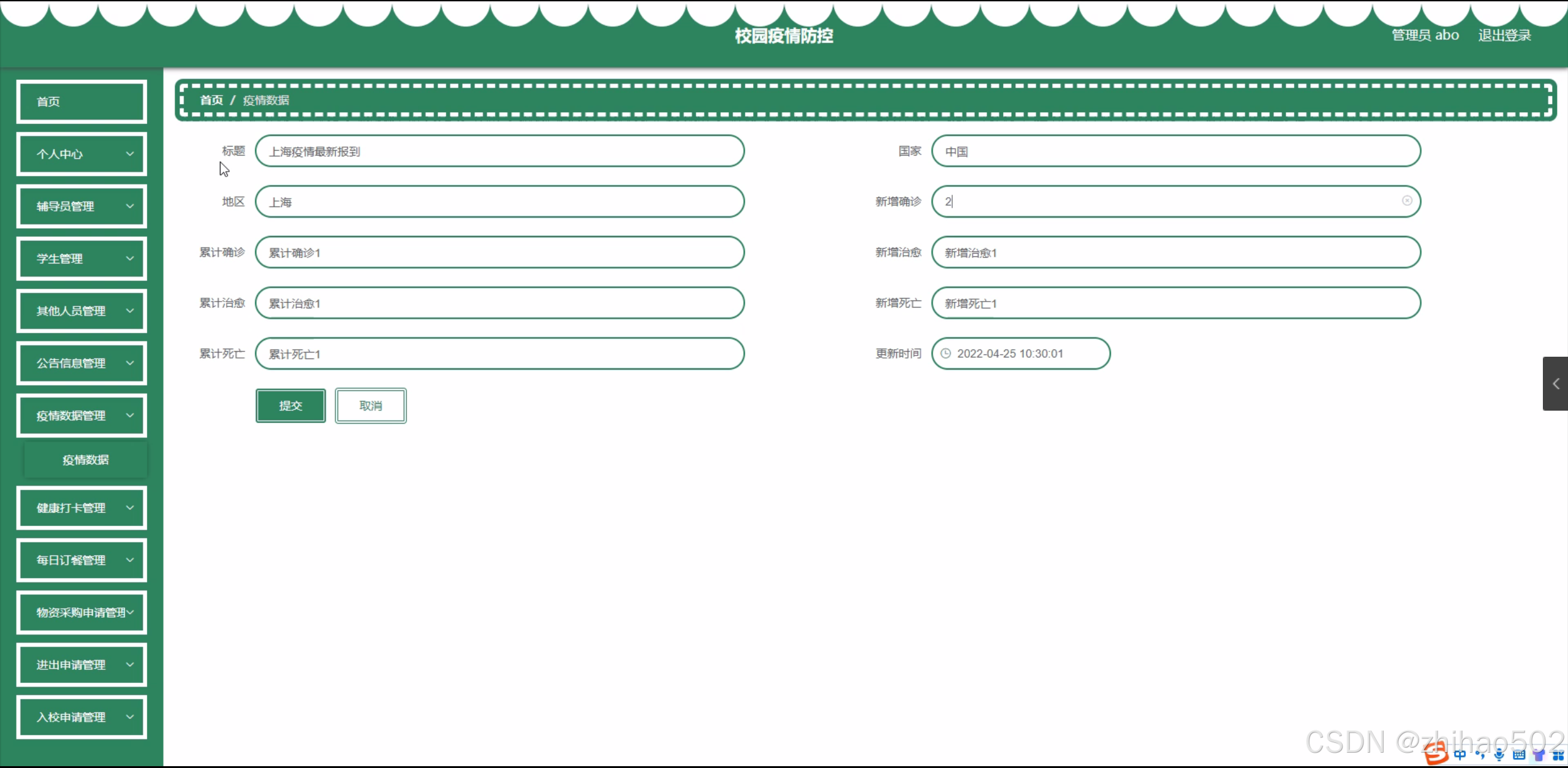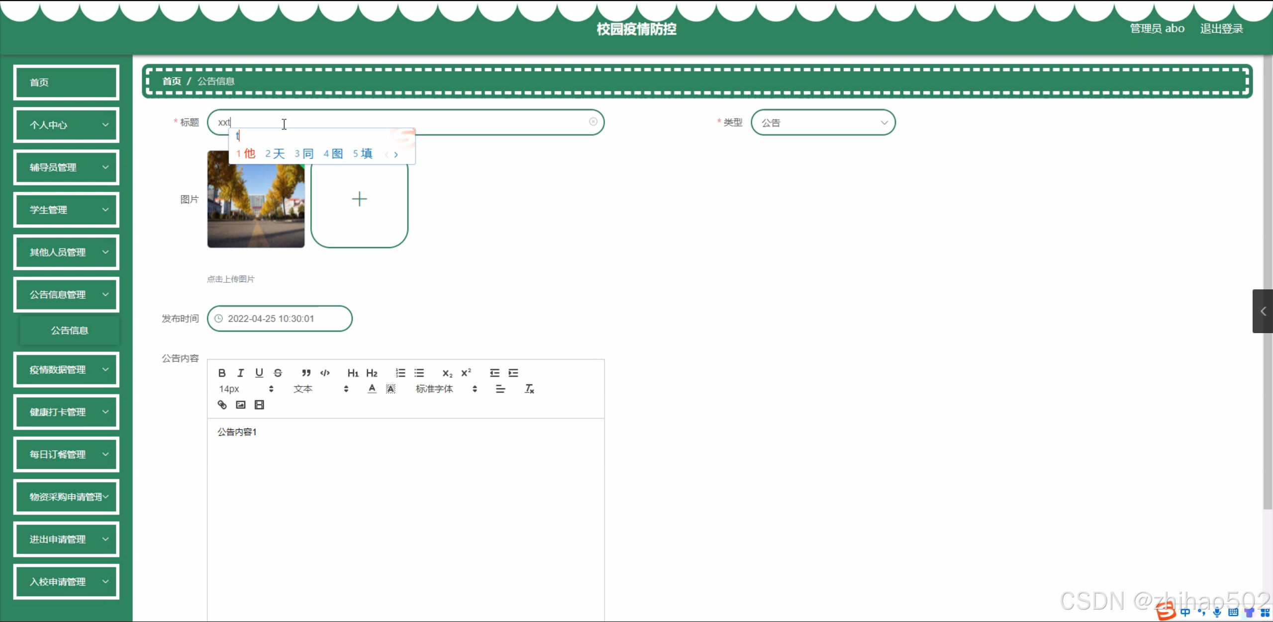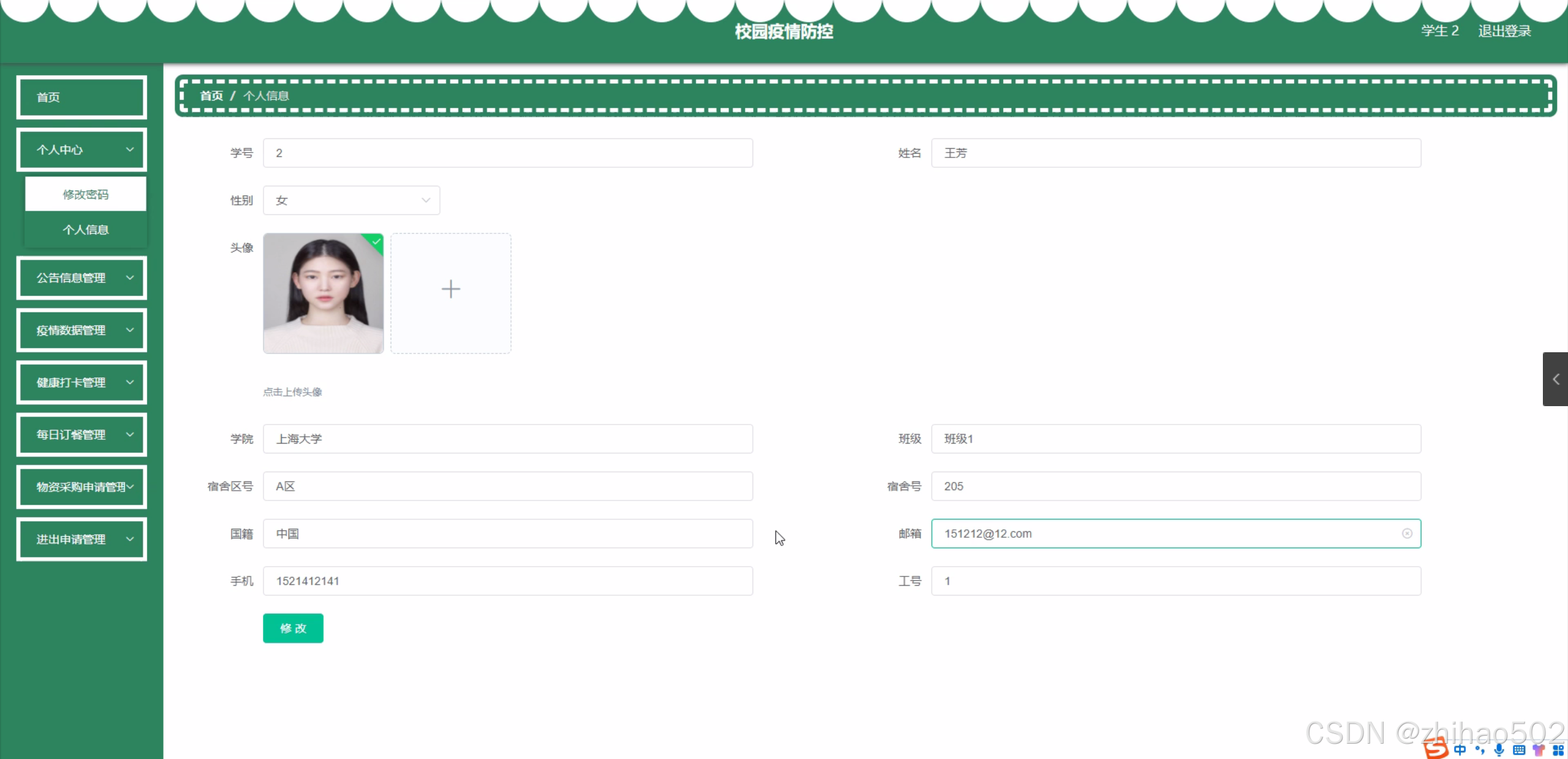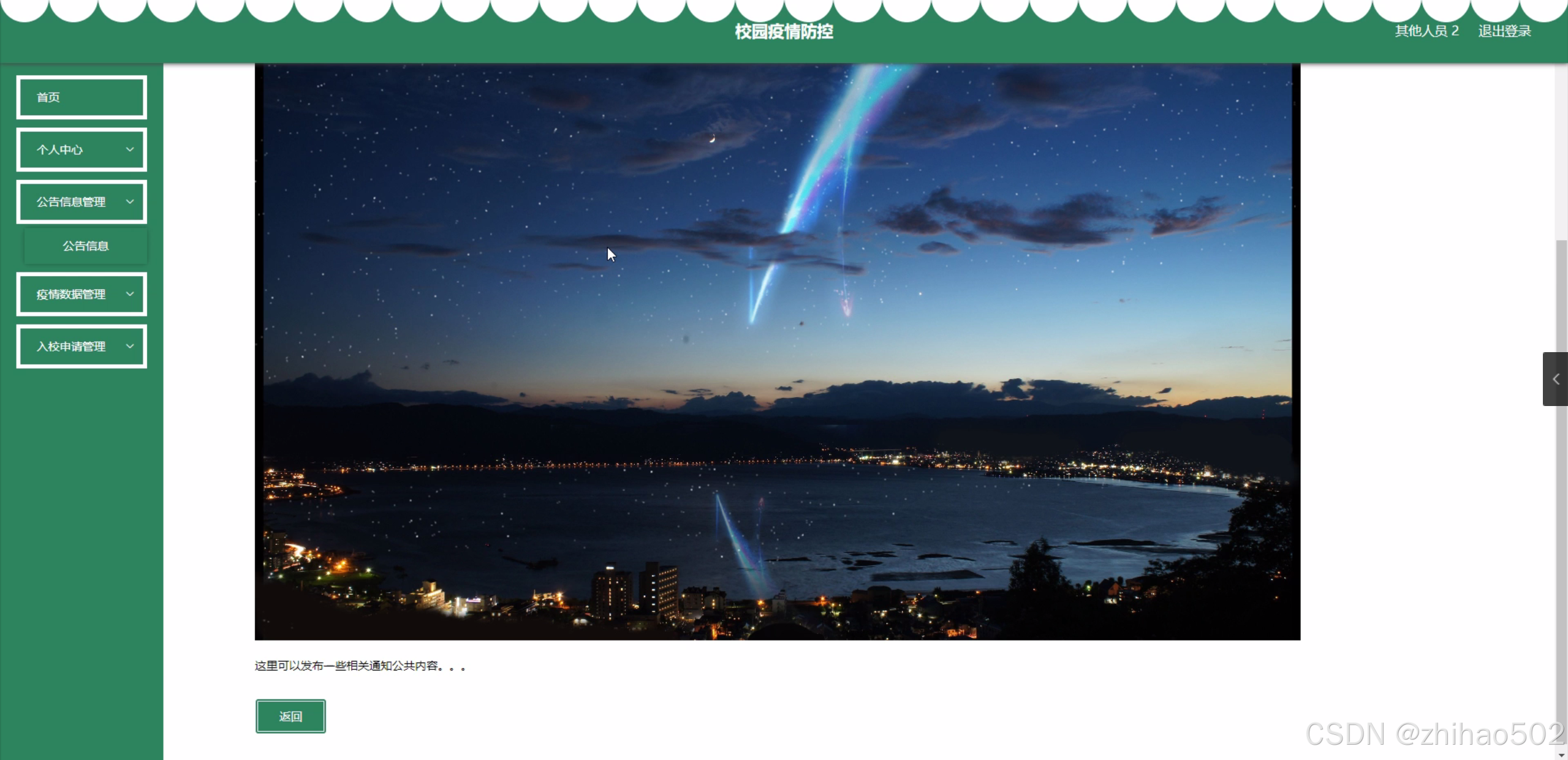 本研究将围绕校园疫情防控的系统功能展开,具体包括辅导员、学生、其他人员的管理功能,公告信息的发布功能,国内疫情和世界疫情的监测功能,健康打卡的监管功能,每日订餐、物资采购申请、进出申请、入校申请的审批功能,以及健康行程码的校验功能等。通过对这些系统功能的深入研究,分析其在校园疫情防控中的作用和效果,提出优化和改进的建议,为校园疫情防控提供更加科学、有效的支持。